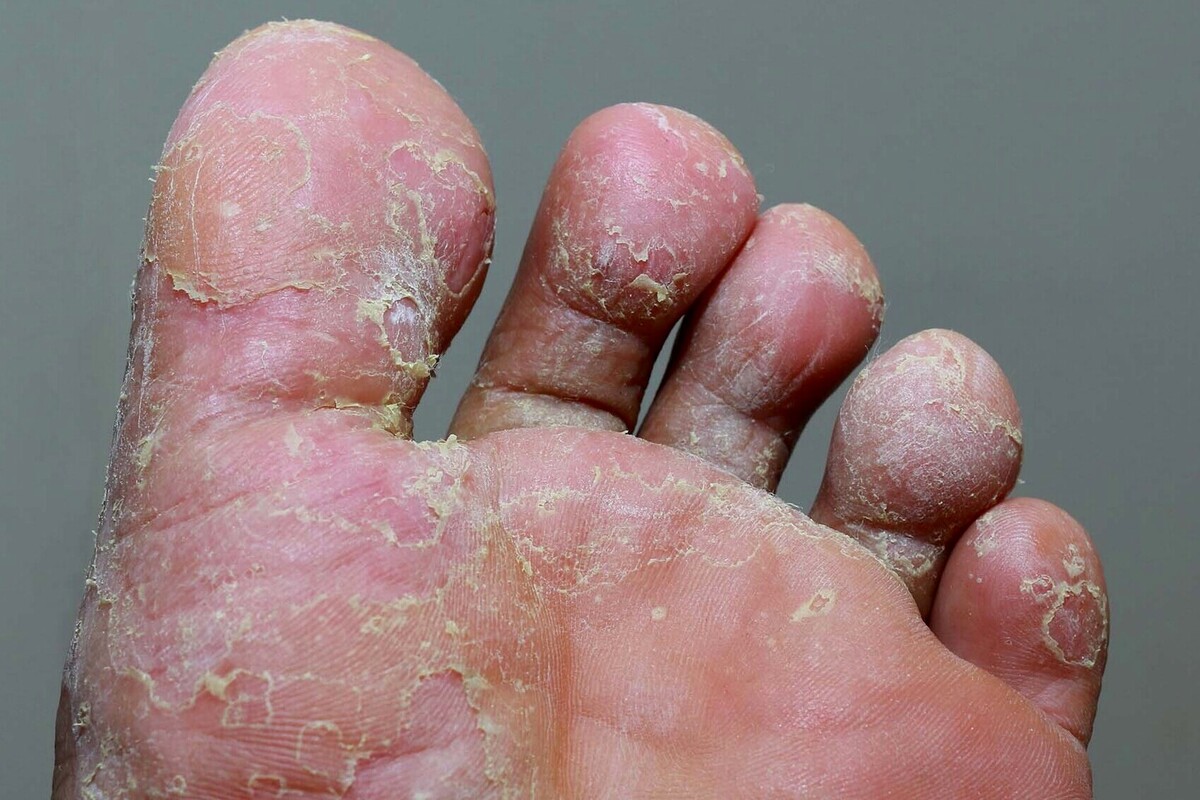 Infeksi ini muncul sebagai pengelupasan, gatal, dan terkadang retakan yang menyakitkan pada kulit.