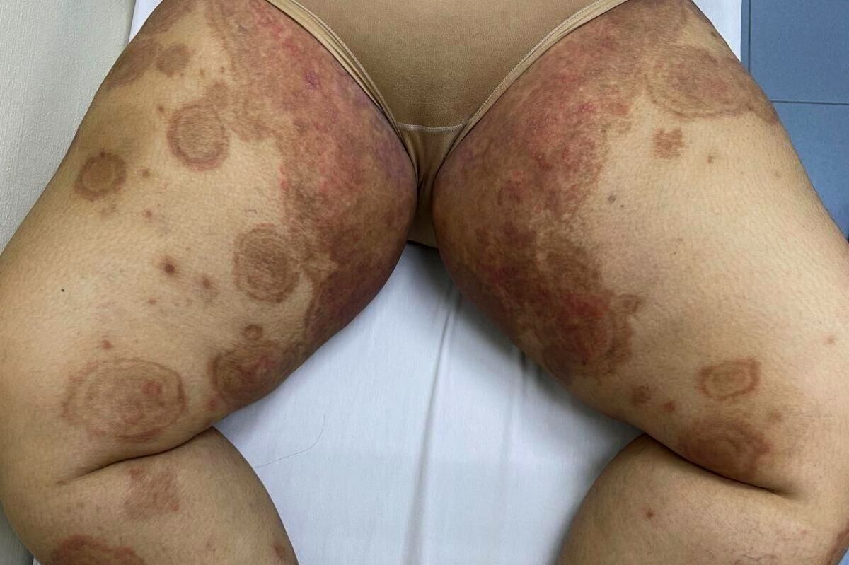 Muncul bercak merah dan gatal dengan batas yang jelas yang dapat meluas hingga ke kaki.